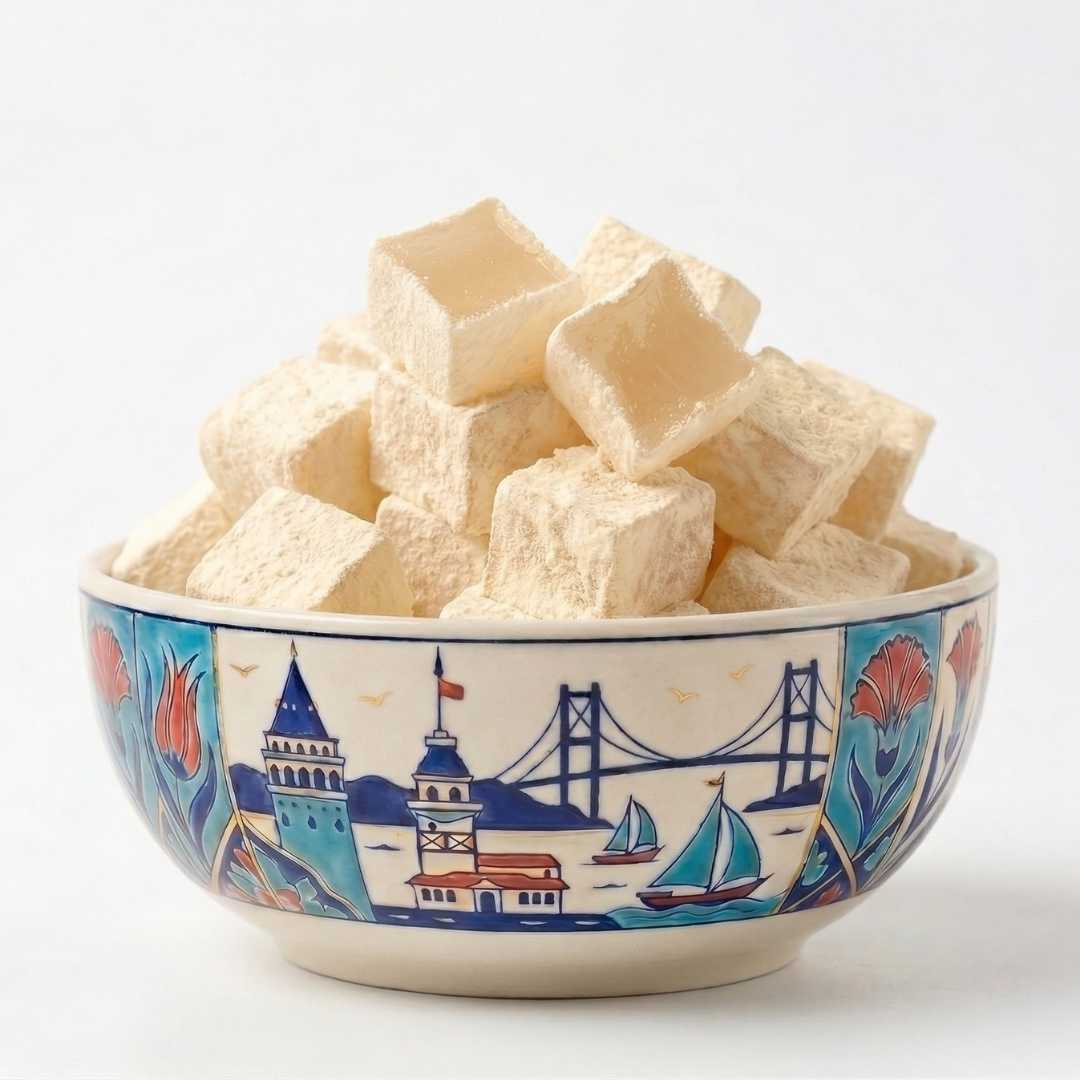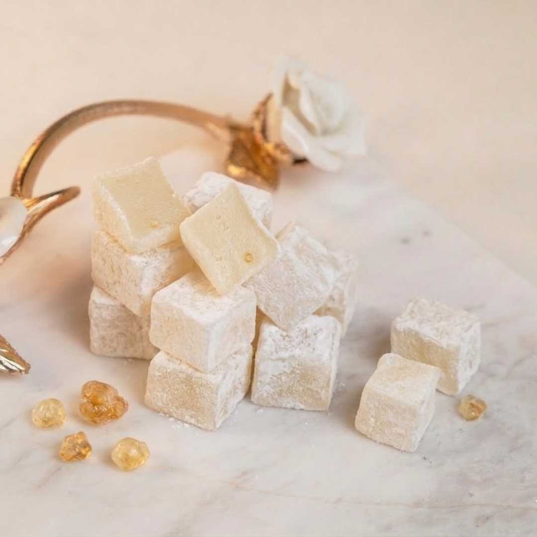 İçerik: Doğal damla sakızı aroması, %100 doğal pancar şekeri ve geleneksel yöntemlerle hazırlanan, katkısız lokum.